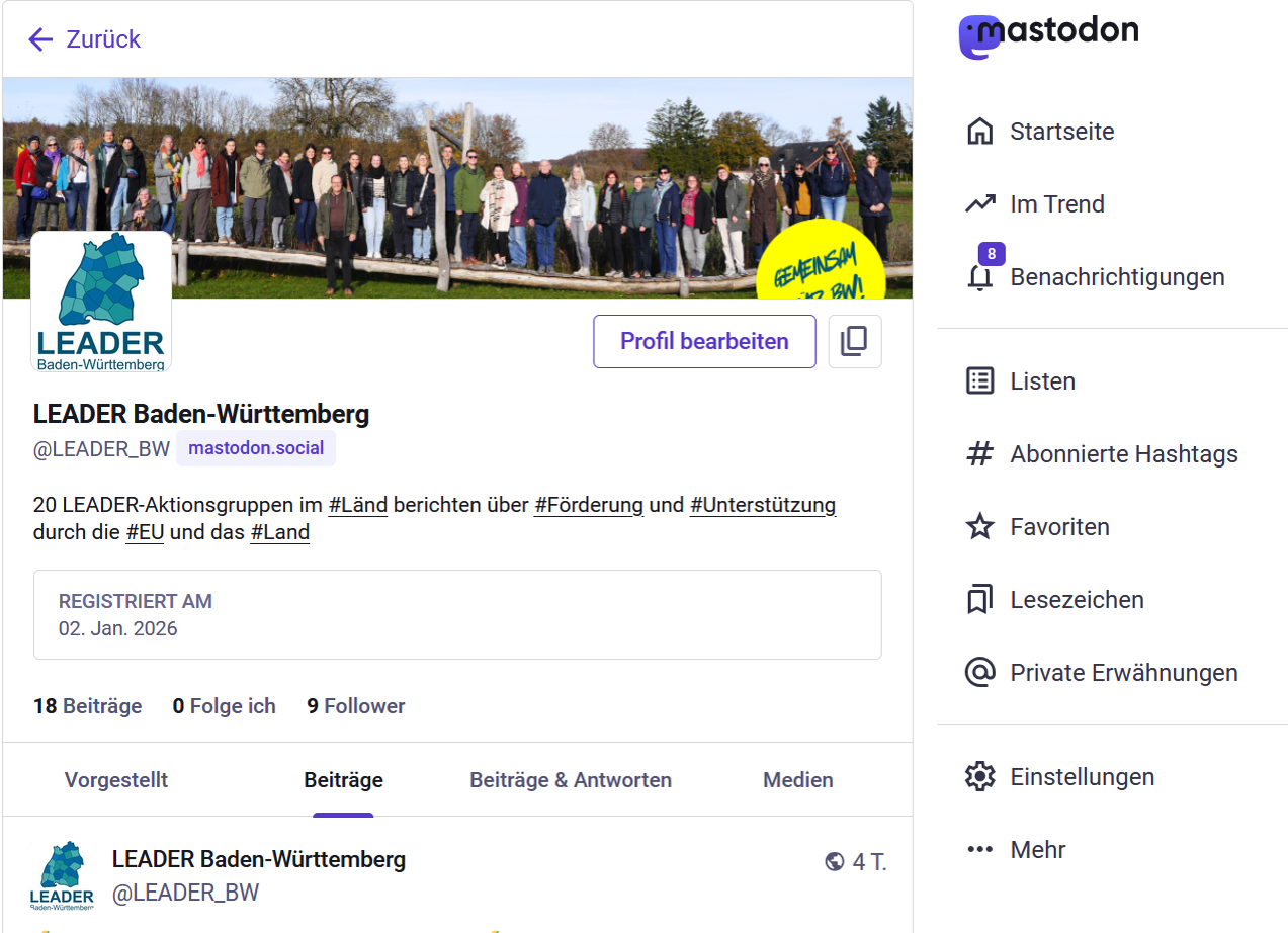 Außerdem gibt es seit Kurzem einen landesweiten Social-Media-Auftritt aller LAGs aus Baden-Württemberg auf Instagram, Facebook und Mastodon.