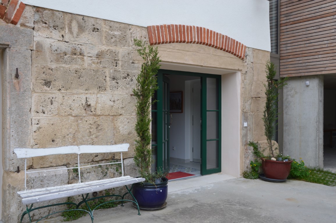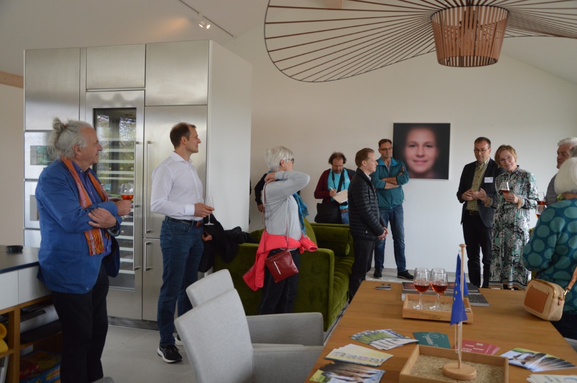 Statt die lange leer gestandene ehemalige Knechtsunterkunft auf dem damals zweitgrößten Hof Obermarchtals abzureißen, entschied sich das Besitzerehepaar Köberle dazu, das Kleinod zu erhalten, aufwändig zu sanieren und es für Gäste zu öffnen. Möglich wurde dies auch durch die finanzielle Unterstützung von LEADER. Die Besucher*innen staunten über die großzügige Wohnküche, die den Übernachtungsgästen der drei Schlafzimmer gemeinschaftlich zur Verfügung steht. Hier präsentierte der in der Galerie Petrushof in Obermarchtal – ein ebenfalls von LEADER unterstütztes Projekt – ansässige Medienkünstler Wolf Nkole Helzle die fotografische Installation „Face(s) of Europe“. Für dieses Projekt fotografierte Helzle nahezu 2.000 Menschen jedes Geschlechts, vom Baby bis zum Greis, und legte die Fotos in einer eigens von ihm entwickelten Software transparent übereinander. So entstand „das europäische Gesicht“.