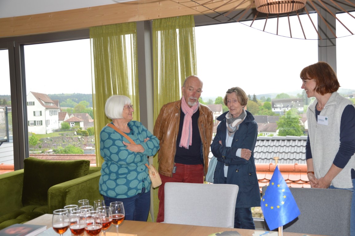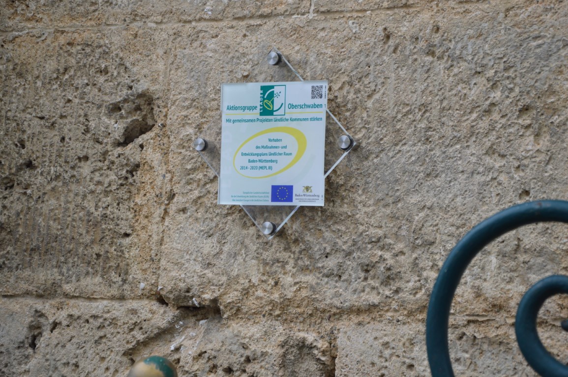 Am Fenster des traditionellen Klostergasthofs Adler bei Familie Schultz wehte eine große Europaflagge. Eine Wimpelkette mit vielen kleinen Europafähnchen flatterte schräg gegenüber zwischen Wohnhaus und dem Gästehaus My Resilia der Familie Köberle. Ein Aufsteller unserer LEADER-Aktionsgruppe Oberschwaben wies den Weg zur Veranstaltung.