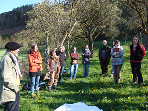 Obstblüten erforschen, Vogelstimmen lauschen, Wildbienen beim Schlüpfen beobachten und Wiesenpflanzen kennen lernen: Das sind nur ein paar Bausteine des ersten Wochenendes der BUND-Fortbildung „Streuobstpädagogik“. Sie findet an vier Wochenenden in Kooperation mit dem Haus der Natur in Beuron statt und wird durchgeführt von der Biologin und Naturpädagogin Angela Klein. Fünfzehn Teilnehmerinnen und Teilnehmer, die mit Kindern arbeiten, werden in diesem Rahmen dafür qualifiziert, Natur - und speziell die Streuobstwiesen – in ihrer Arbeit mit Kindern mehr zum Thema zu machen. Mit von der Partie sind Erzieherinnen, Kindergruppenleiter des NABU und des BUND, Fachwarte für Obstbaumpflege, Museumspädagogen sowie Teilnehmer, die Flüchtlingskinder oder Feriengäste mit Streuobstwiesen und ihren Bewohnern vertraut machen möchten.