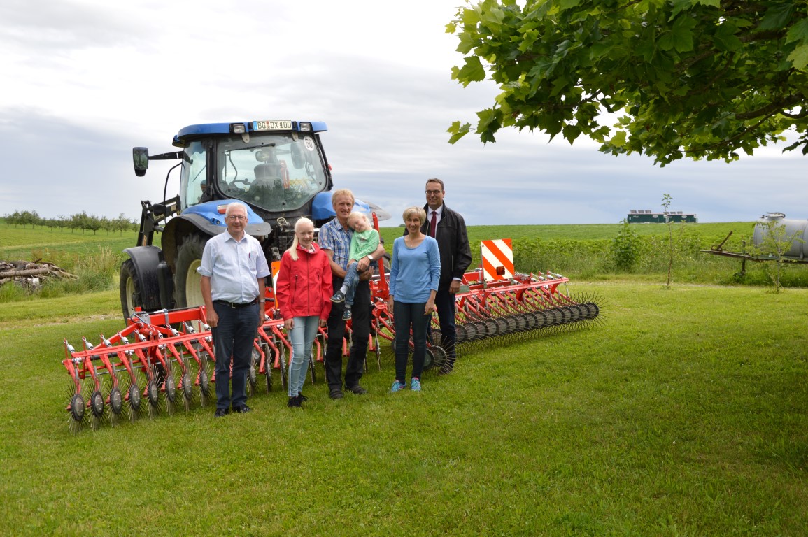 Das Bild zeigt Familie Rehm mit Bürgermeister Werner Binder (rechts) und LEADER-Vorsitzendem Alois Henne (links) bei der Projektabnahme.